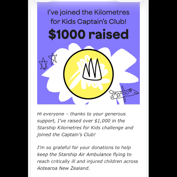 I’m taking on a month-long fitness challenge, Kilometres for Kids, to help keep Starship’s National Air Ambulance flying to children across the country who are critically ill or injured.